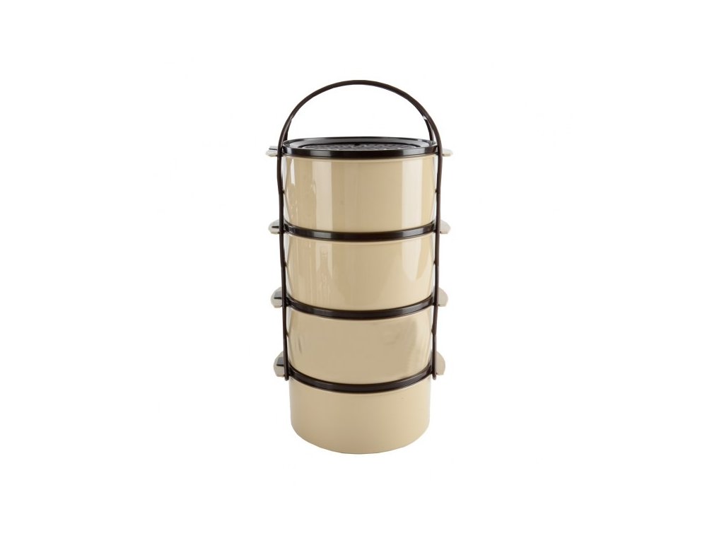 Jednotlivé misky jsou vybaveny vlastními víčky, což zajišťuje hygienu a zabraňuje osychání pokrmů. Celý set je pevně fixován pomocí **kovového stojanu (stahovadla)**, který je opatřen praktickou pojistkou a madlem pro pohodlné přenášení v jedné ruce. Díky použitému materiálu je jídlonosič lehký a snadno omyvatelný. Je vhodný pro každodenní nošení obědů z restaurací, jídelen nebo pro převoz domácí stravy na chalupu či k blízkým.
