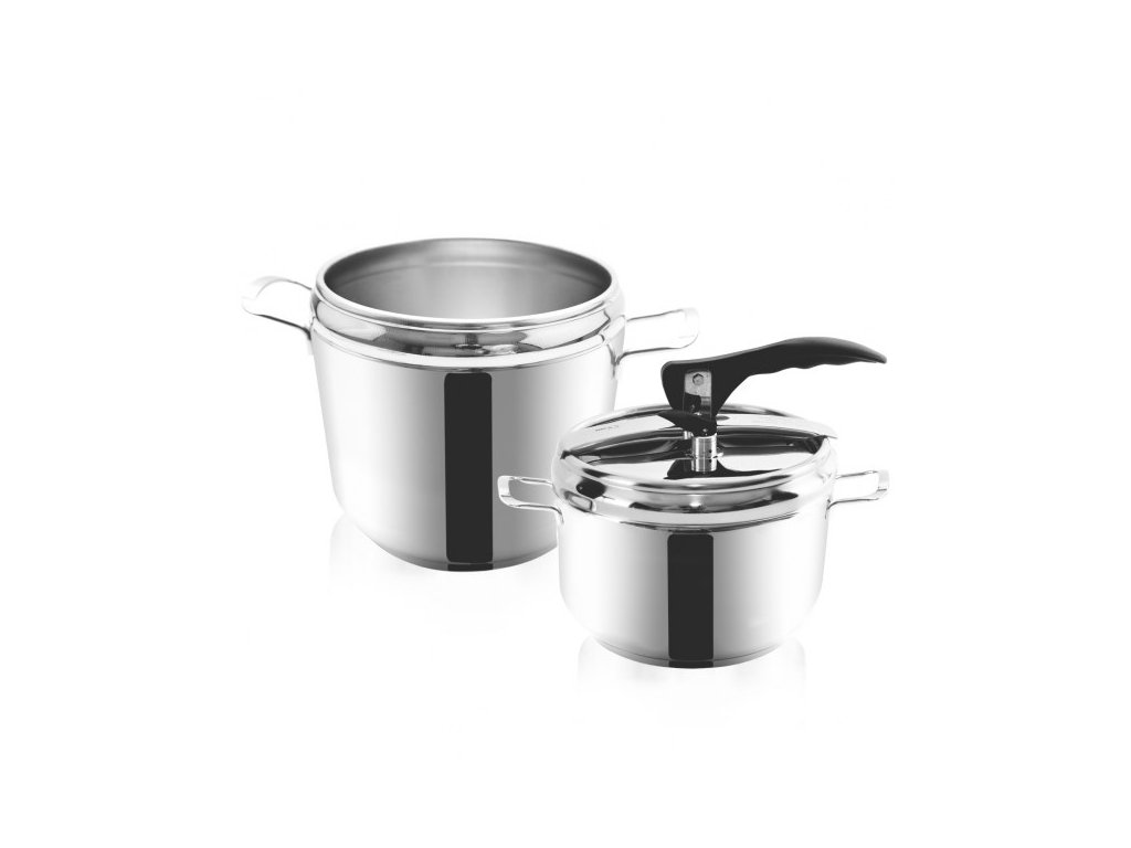 - DUO set – Dvě v jednom: Získáte nádoby s objemy 7 l a 4 l, které sdílí jedno tlakové víko. Ideální pro flexibilitu v kuchyni.