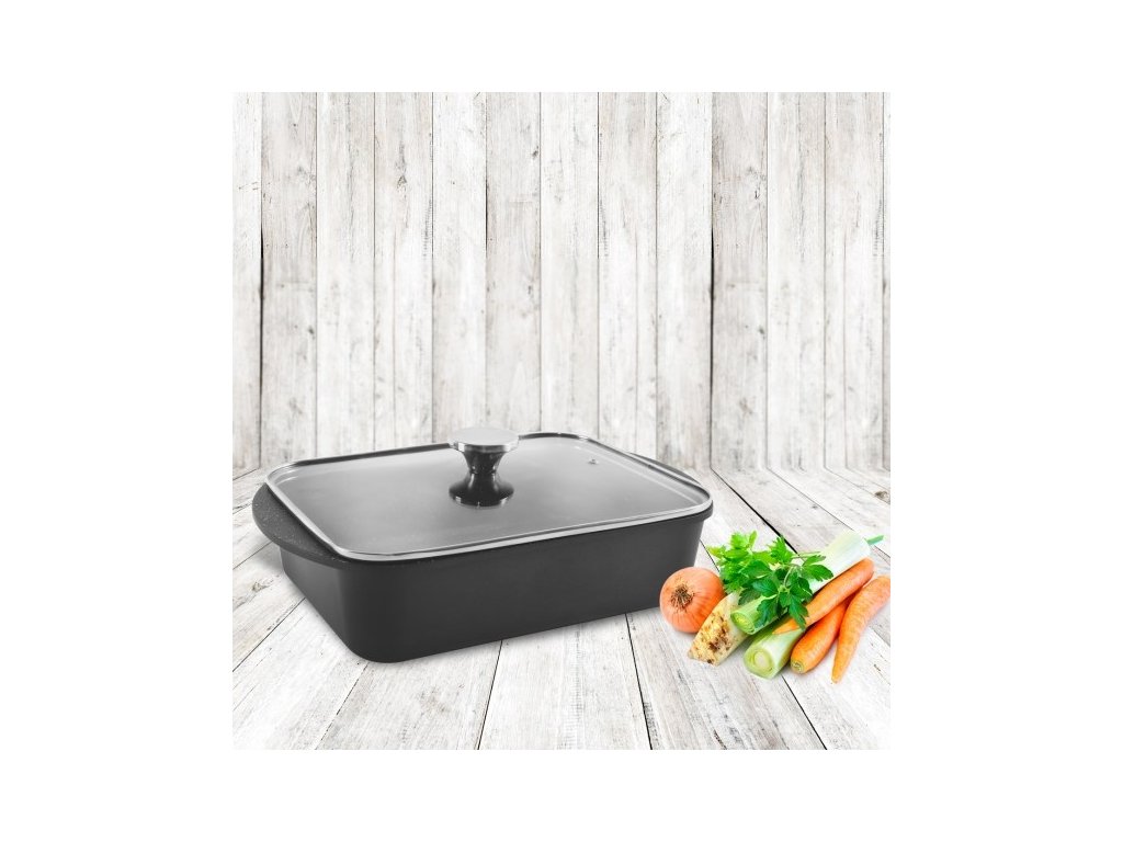Všestranný pekáč s nepřilnavým povrchem o rozměru 35x22,5x8 cm má po přiklopení poklicí na výšku 12 cm. Hliníkový korpus je potažen kvalitní nepřilnavou vrstvou PFLUON GRANIT, která umožňuje pečení s minimem tuku, ale i snadnou údržbu a možnost mytí v myčce. Omáčky i zredukované šťávy snadno stáhnete třeba stěrkou, nákypy, nádivky a pečeni lehce naberete nylonovými nebo dřevěnými obracečkami a můžete servírovat. Odlévaný masivní pekáč je opatřen skleněnou poklicí s nerezovým lemem a otvorem pro únik přebytečné páry, budete tak mít přehled nad stavem připravovaného pokrmu. Přednosti nádobí GRANDE: vyrobeno ze slitiny hliníku potaženého kvalitním antiadhezním povrchem PFLUON GRANIT pevné rukojeti zajistí bezpečnou manipulaci nádobí je kompatibilní se všemi druhy varných desek včetně indukce je určen pro pečení, zapékání a gratinování v troubě, s poklicí až do 200 °C hliníkové tělo pekáče je výborným vodičem tepla, proto lze troubu vypnout s předstihem a nechat pokrm "dojít" lze umývat v myčce, avšak vlivem agresivních čisticích prostředků může dojít k nepatrné oxidaci (tento stav nemá vliv na proces vaření, není zdravotně závadný a nemůže být důvodem reklamace). Doporučujeme: při intenzivním ohřevu používejte chňapky. Pokud pekáč použijete na sporáku, zvolte velikost plotýnky úměrnou průměru dna a dřevěné, silikonové nebo nylonové náčiní. Vlastnosti produktu Kolekce: GRANDE Materiál: hliníková slitina s nepřilnavým povrchem Poklice: ano Materiál poklice: sklo, nerezová ocel Indukce: ano Nepřilnavý povrch: ano Barvy: černá Délka (cm): 35 Šířka (cm): 22,5 Výška (cm): 8 Výška s poklicí (cm): 12 Hmotnost (g): 1706 Materiál ucha: hliníková slitina Vlastnosti: profilované dno Vhodné do myčky: ano Vhodné do mikrovlnky: ne Vhodné do trouby: anoDoplňkové parametry