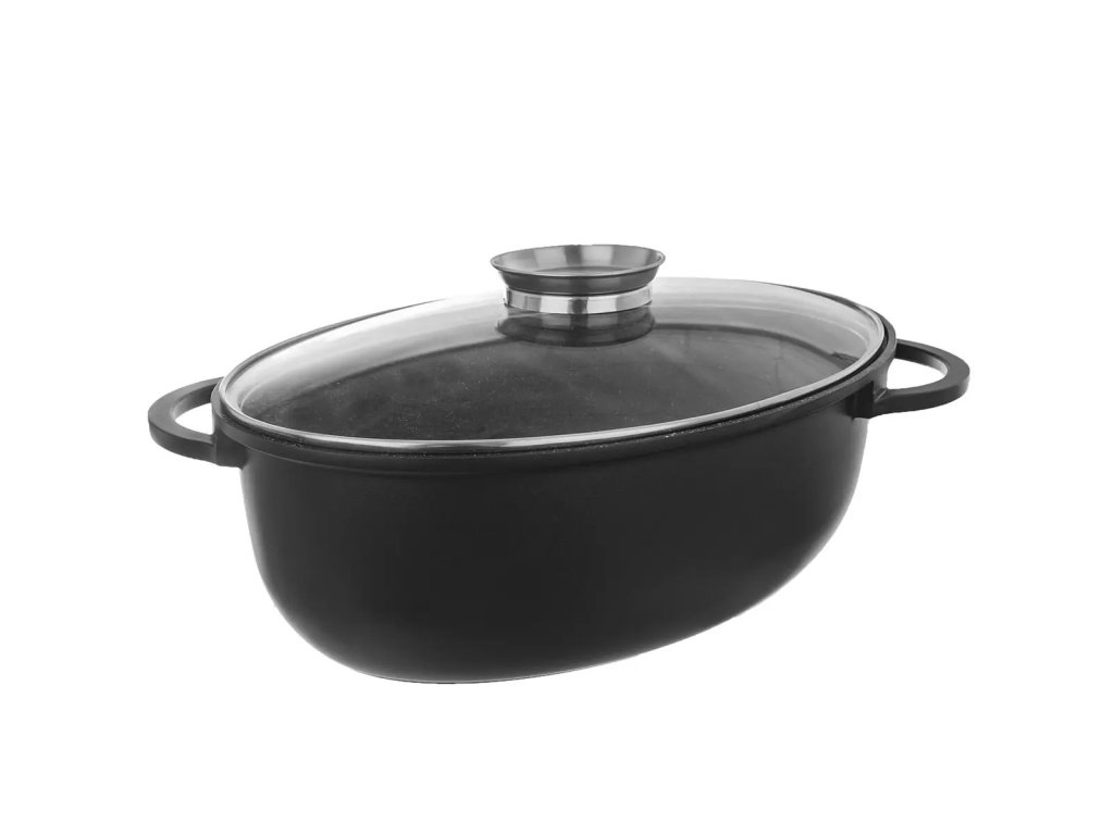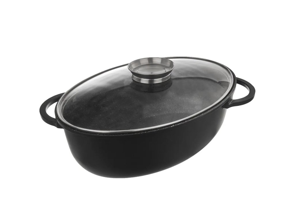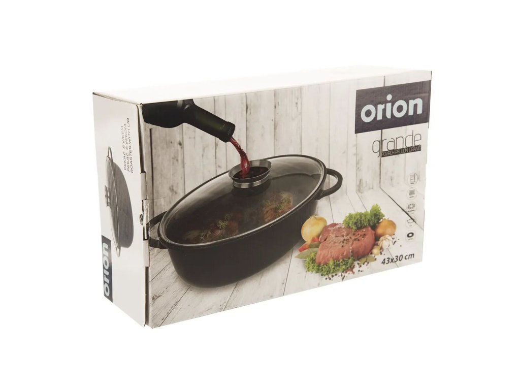 Kombinaci pečení s minimálním množstvím tuku v troubě a aromatizované vaření na všech typech sporáků včetně indukce, nabízí pekáč GRANDE. Díky rozměru 43x30x19 cm a mimostředně umístěným úchytům se pohodlně vejde do běžné kuchyňské trouby. Pekáč o vnitřním rozměru 38x25x13 cm lze použít jako klasický pekáč. Skleněná poklice s aroma úchytem umožní jemné dávkování tekutých dochucovadel, olejů, vína a marinád. Přednosti aroma pekáče: vyrobeno ze slitiny hliníku potaženého kvalitním antiadhezním povrchem PFLUON GRANIT, z vnější strany je opatřen nepřilnavým povrchem PTFE. pevné rukojeti zajistí bezpečnou manipulaci nádobí je kompatibilní se všemi druhy varných desek včetně indukce je určen pro pečení, zapékání a gratinování v troubě při teplotách do 230 °C, s poklicí až do 200 °C hliníkové tělo pekáče je výborným vodičem tepla, proto lze troubu vypnout s předstihem a nechat pokrm "dojít" skleněná poklice je opatřena aroma úchytem, do něhož můžete nalévat víno, aromatizované oleje a dochutit pokrm bez nutnosti odklopení poklice lze jej umývat v myčce nádobí, avšak vlivem agresivních čisticích prostředků může dojít k nepatrné oxidaci (tento stav nemá vliv na proces vaření, není zdravotně závadný a nemůže být důvodem reklamace). Doporučujeme: při intenzivním ohřevu používejte chňapky. Pokud pekáč použijete na sporáku, zvolte velikost plotýnky úměrnou průměru dna a dřevěné, silikonové nebo nylonové náčiní. Vlastnosti produktu Kolekce: GRANDE Materiál: hliníková slitina s nepřilnavým povrchem Poklice : ano Materiál poklice: sklo, nerezová ocel Indukce: ano Nepřilnavý povrch: ano Barvy: černá Délka (cm): 43 Šířka (cm): 30 Výška (cm): 13,5 Výška s poklicí (cm): 19 Hmotnost (g): 2 420 Materiál ucha: hliníková slitina Vhodné do myčky: ano Vhodné do mikrovlnky: ne Vhodné do trouby: anoDoplňkové parametry