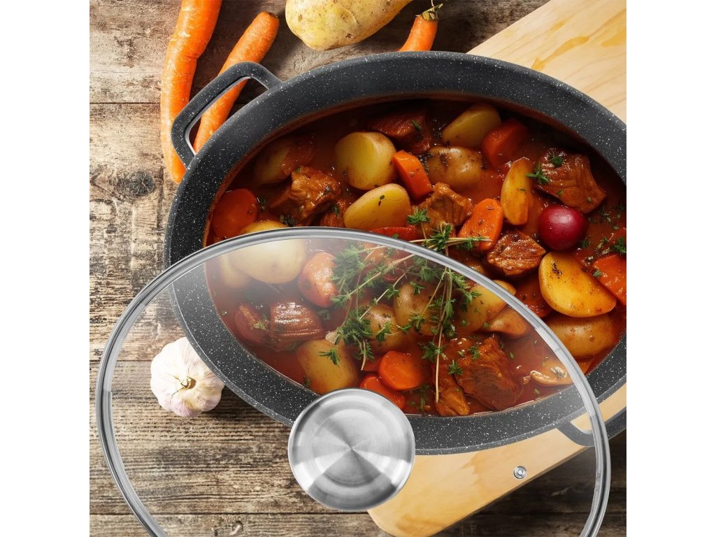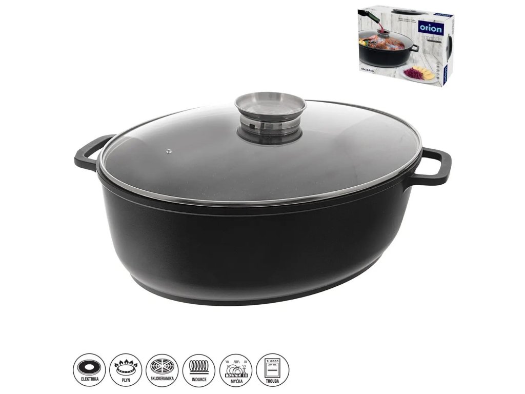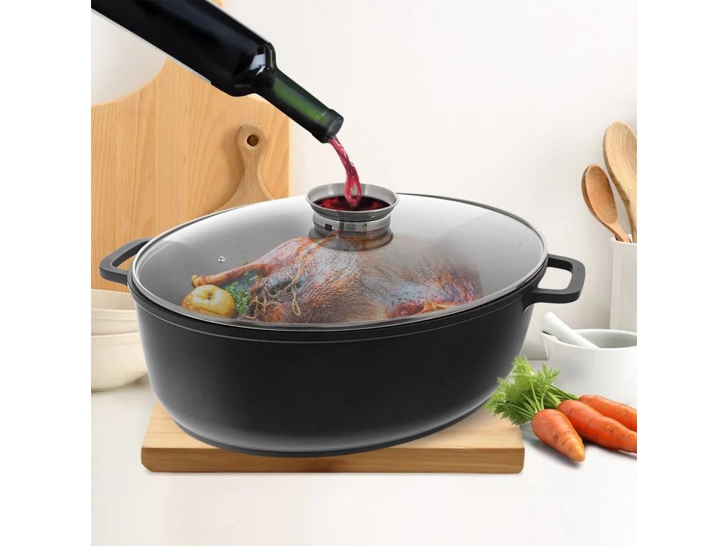 Pekáč GRANDE JUMBO využijete jako klasický pekáč na přípravu masa pro celou rodinu nebo jako aroma pekáč s poklicí. Díky své velikosti se skvěle hodí na vaření nebo pečení většího množství jídla. Je skvělý na husu nebo krůtu, na vepřovou pečeni, pohodlně v něm uvaříte velké šišky knedlíků, využít jej můžete při vaření všech surovin společně v jednom hrnci (kuře s brambory a nádivkou)... Skleněná poklice s otvorem pro únik páry a s aroma úchytem umožní jemné dávkování tekutých dochucovadel-olejů, vína… bez nutnosti odklopení poklice. Dochucovadlo nalijete do úchytu a ono samovolně protéká skrz otvor dovnitř do pekáče. Pekáč je opatřen uvnitř velmi kvalitním nepřilnavým povrchem PFLUON GRANIT ve 2 vrstvách, který Vám umožní přípravu jídel na minimálním množství tuku. Vně je jedna vrstva kvalitního nepřilnavého povrchu PTFE. Díky úpravě vnějšího povrchu můžete pekáč použít na všechny typy tepelných zdrojů včetně indukce a do trouby (skleněná poklice max. 200 °C, pekáč max. 230 °C). Výhodou jsou mimostředně umístěné úchyty, díky kterým se pekáč pohodlně vejde do trouby. Materiál: slitina hliníku s velmi kvalitním nepřilnavým povrchem, skleněná poklice s nerezovou aroma nálevkou. Výhodou je jeho lehkost a snadná manipulace. Rozměry: vnitřní 42x32x13 cm, vnější 43x33,5x14 cm, celková výška s poklicí 20 cm. Při manipulaci doporučujeme použití kuchyňských chňapek. Vhodný do ledničky, do myčky na nádobí – vlivem agresivních čisticích prostředků může dojít k nepatrné oxidaci dna – tento jev nemá vliv na proces vaření, není zdravotně závadný a nemůže být předmětem reklamace. Náhradní poklice z naší nabídky 711439. Součástí balení je několik receptů.Doplňkové parametry