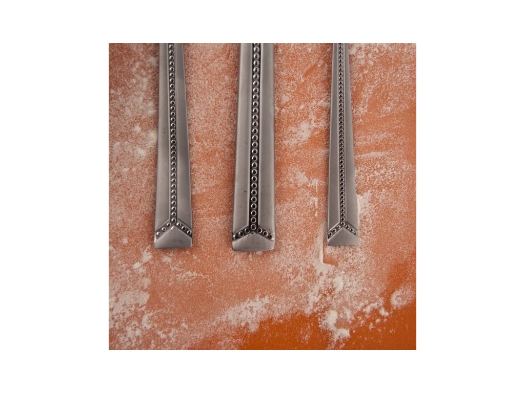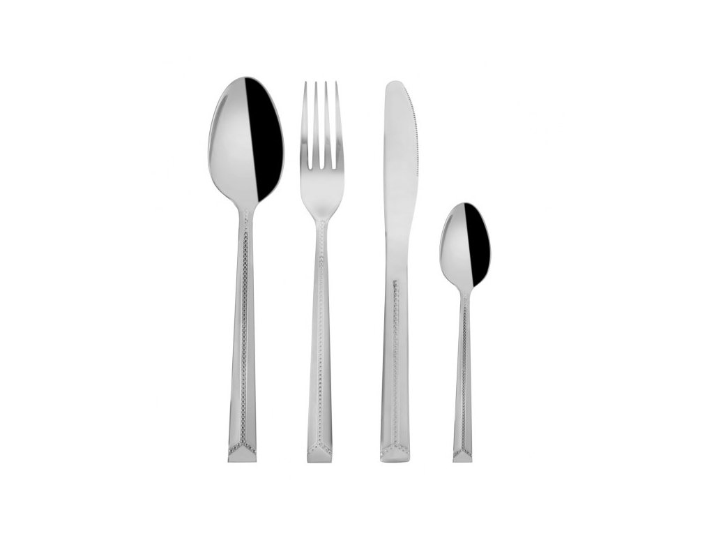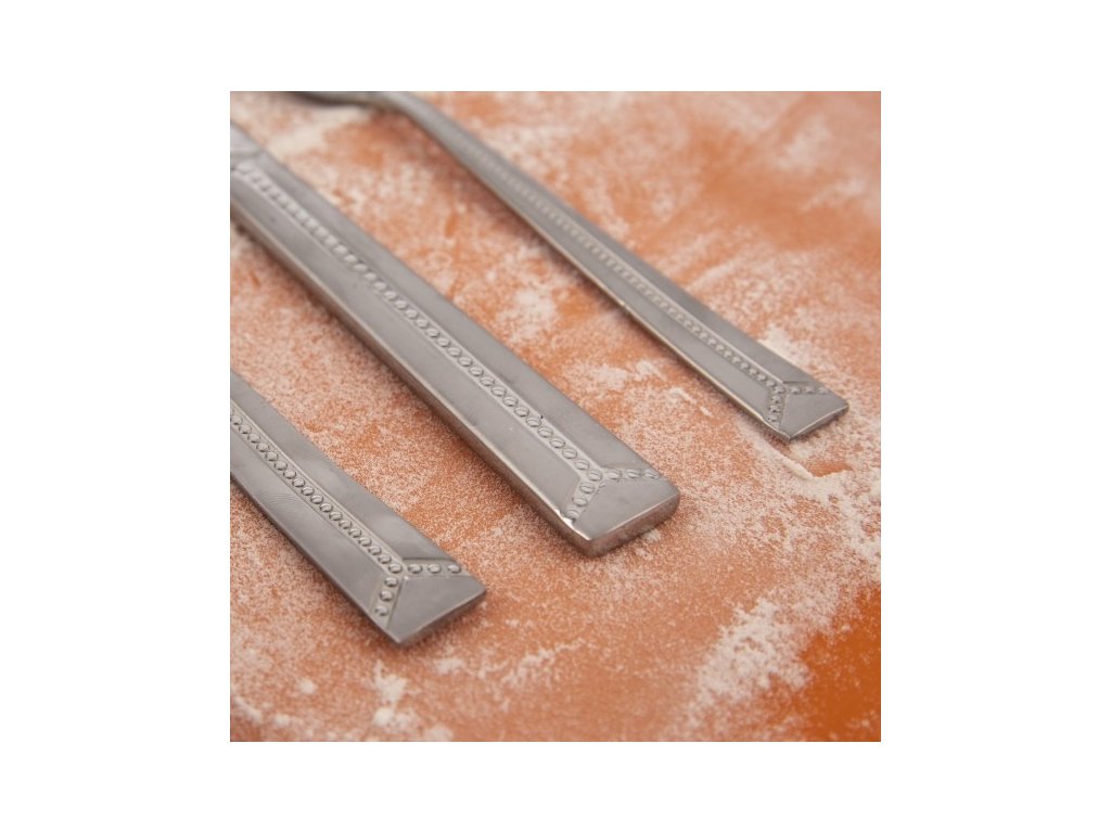 Elegantní lesklé nerezové příbory s korálkovým vzorem a pískovanou matnou plochou na rukojeti mají klasický tvar s rovnou spodní částí. Příjemně se drží v ruce. Jsou vhodné pro každodenní stravování i pro speciální, slavnostní příležitosti. Lze je umývat v myčce nádobí, pro zachování krásného vzhledu ale doporučujeme umývat ručně. Sada obsahuje: 6x nůž 6x vidlička 6x polévková lžíce 6x čajová lžička Vlastnosti produktu Materiál: nerezová ocel Hmotnost (g): 1180 Použití: příborový Vlastnosti: sada Vhodné do myčky: ano Motiv: protlačovaný vzor Pro děti: neDoplňkové parametry