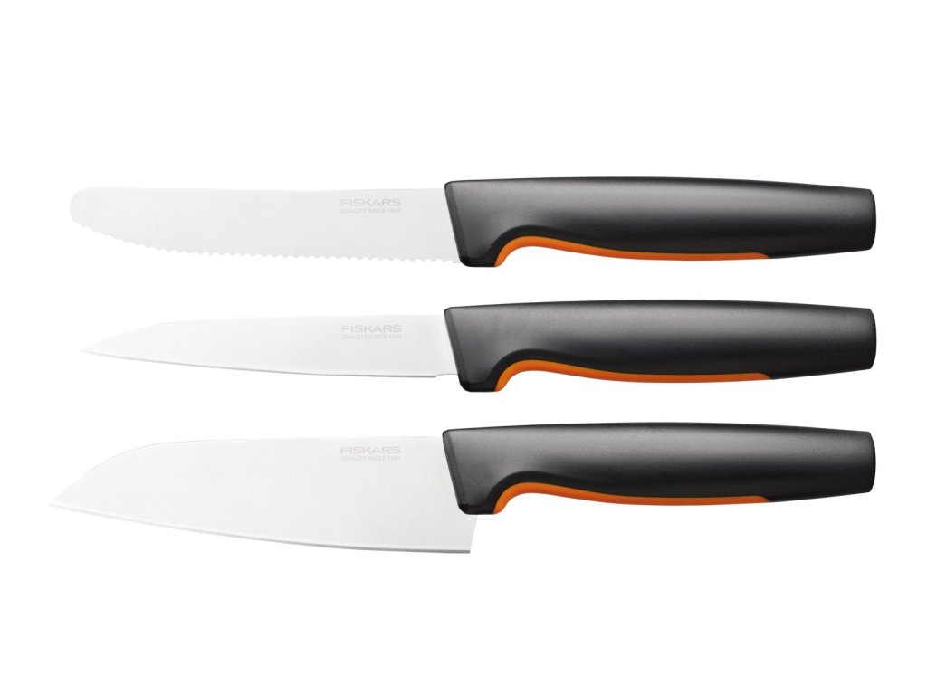 Sada nožů Fiskars Functional Form obsahuje tři základní nože pro každodenní přípravu pokrmů. Každý nůž má odolnou čepel z japonské nerezové oceli, ergonomické rukojeti nožů mají povrch SoftGrip a hluboké chrániče prstů pro bezpečné a pohodlné držení. Sada obsahuje loupací nůž (8 cm), malý kuchařský nůž (13 cm) a snídaňový nůž (12 cm). Loupací nůž má rovnou čepel pro snadné oloupávání ovoce a zeleniny. Snídaňový nůž má čepel se zoubky pro krájení ovoce a zeleniny se slupkou a malý kuchařský nůž má rovnou čepel, která je vhodná pro krájení většiny druhů potravin v kuchyni Nože lze mýt v myčce na nádobí.Doplňkové parametry