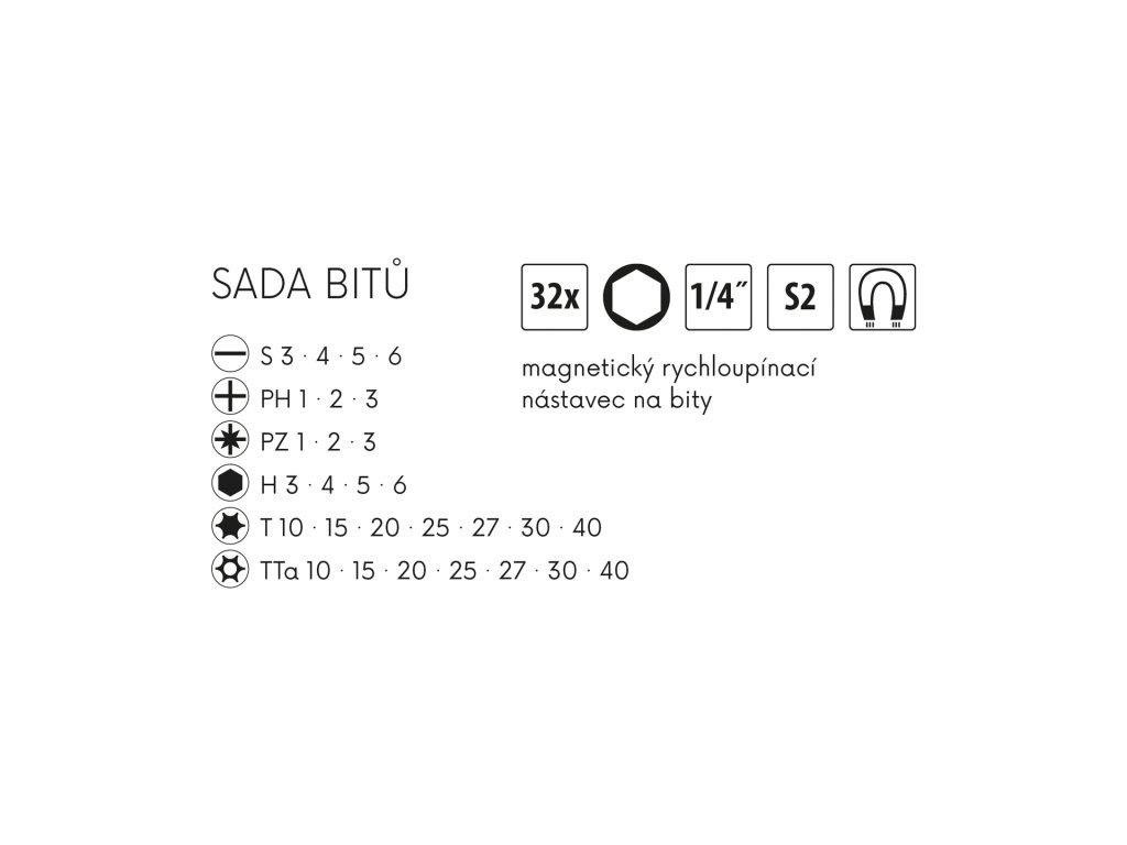 Sada bitů 32ks FESTA, S2 (5036), PH, S, T, Tta, XZN, H + magnetický nástavec.