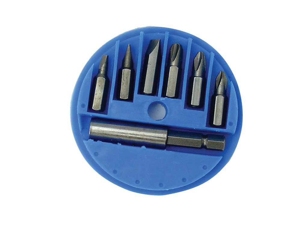 Bity v plastové kruhové krabičce s otvorem pro vysunutí potřebného bitu. Sada obsahuje 7 ks s manetickými hroty( - 3,5,7 + PH1,PH2PH3). Pro hobby použití.