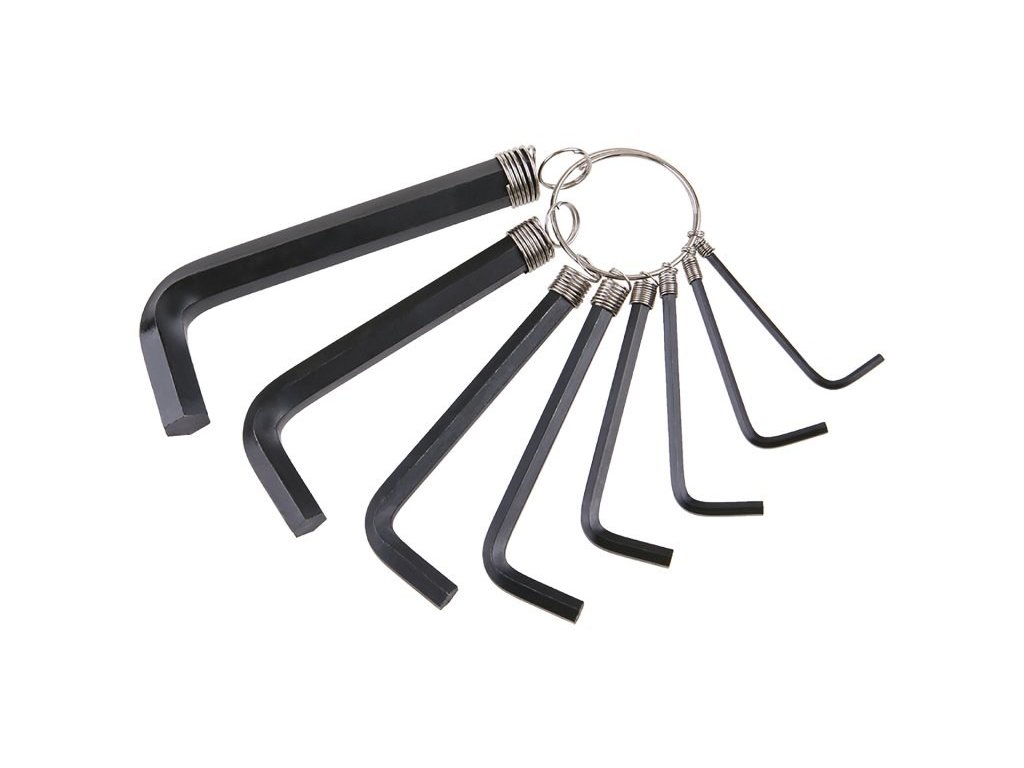 Sada nejpoužívanějších rozměrů L šetihranných klíčů (imbusů), vyrobených z z kvalitní oceli, tvrzených v celé délce, standardní délka, zavěšené pružnými závěsy na kroužku .