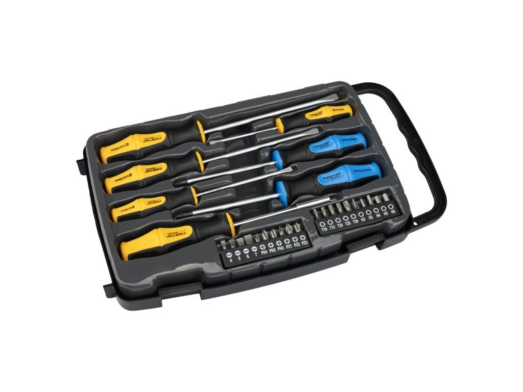 Sada šroubovák s bity 27ks. Legovaná ocel S2, magnetická koncovka, ergonomická dvoukomponentní měkčená rukojeť. Sada obsahuje: 3x plochý šroubovák, 3x křížový šroubovák, 1x šrobovák s bity, 20x bity.