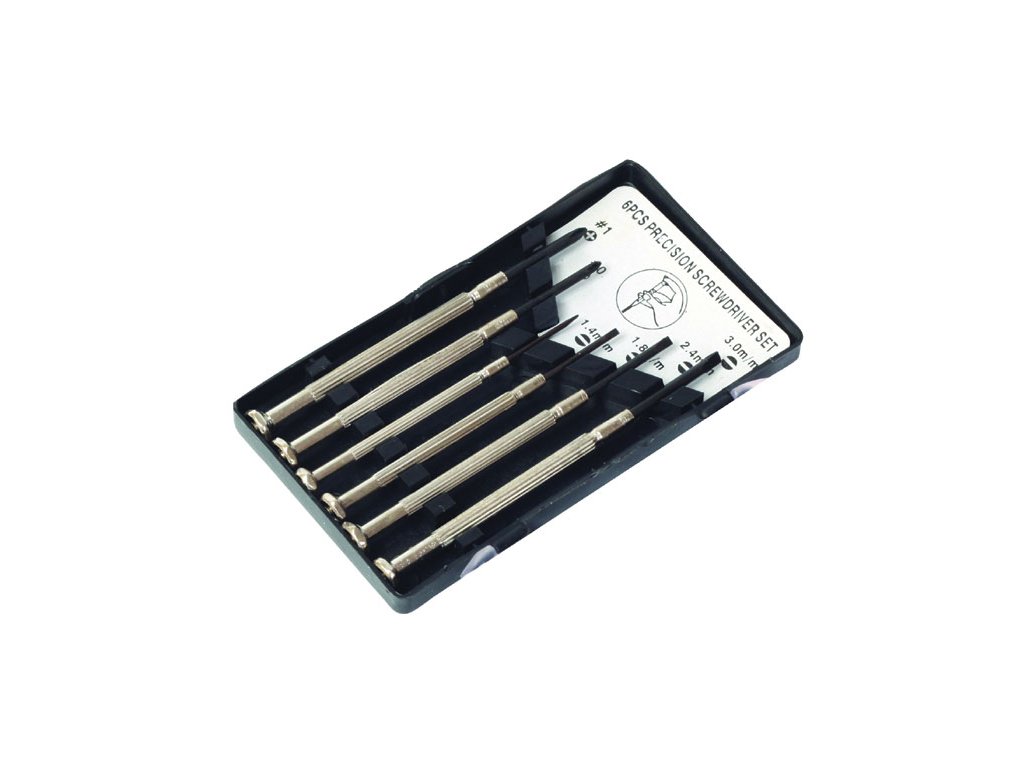 Sada nejpoužívanějších tvarů hrotu a velikostí šroubováků pro jemnou mechaniku a optiku (plochý 1,4; 2; 2,4; 3 + PH0, PH1). Pro hobby použití.