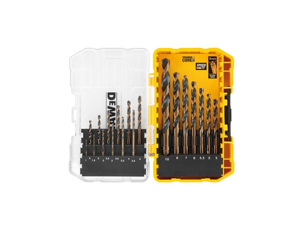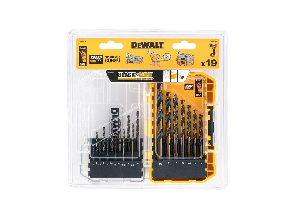 19dílná sada vrtáků do kovu DeWALT DT70728 Vrtáky do kovu Black&Gold 1; 1,5; 2x2; 2x2,5; 2x3; 2x3,5; 2x4; 2x5; 5,5; 6; 7; 8; 10 mm Small Tough Case Vrtáky Black&Gold Odolnější proti zlomení díky patentovanému zúženému jádru (2x delší životnost) Elimunuje prokluzövání stopky vrtáku díky třem ploškám na upínací části vrtáku Parametry Model DT70728 Distribuce CZDoplňkové parametry