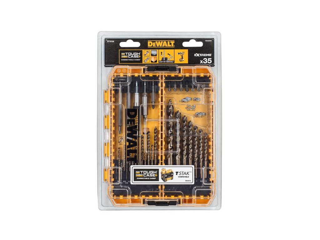 35dílná sada vrtáků a bitů DeWALT DT70756 Vrtáky do kovu EXTREME 2: 1; 1,5; 2; 2,5; 3; 3,2; 3,3; 3,5; 4; 4,2; 4,5; 4,8; 5; 5,5; 6; 6,5; 7; 7,5; 8; 10; 12 Bity 25mm: PZ1; 2xPZ2; PZ3; PH1; PH2; PH3; T20; T25; Bity 50mm: PZ2 Bity 89mm: T20; T25 Magnetický držák bitů Magnetické vodítko Medium Tough CaseDoplňkové parametry
