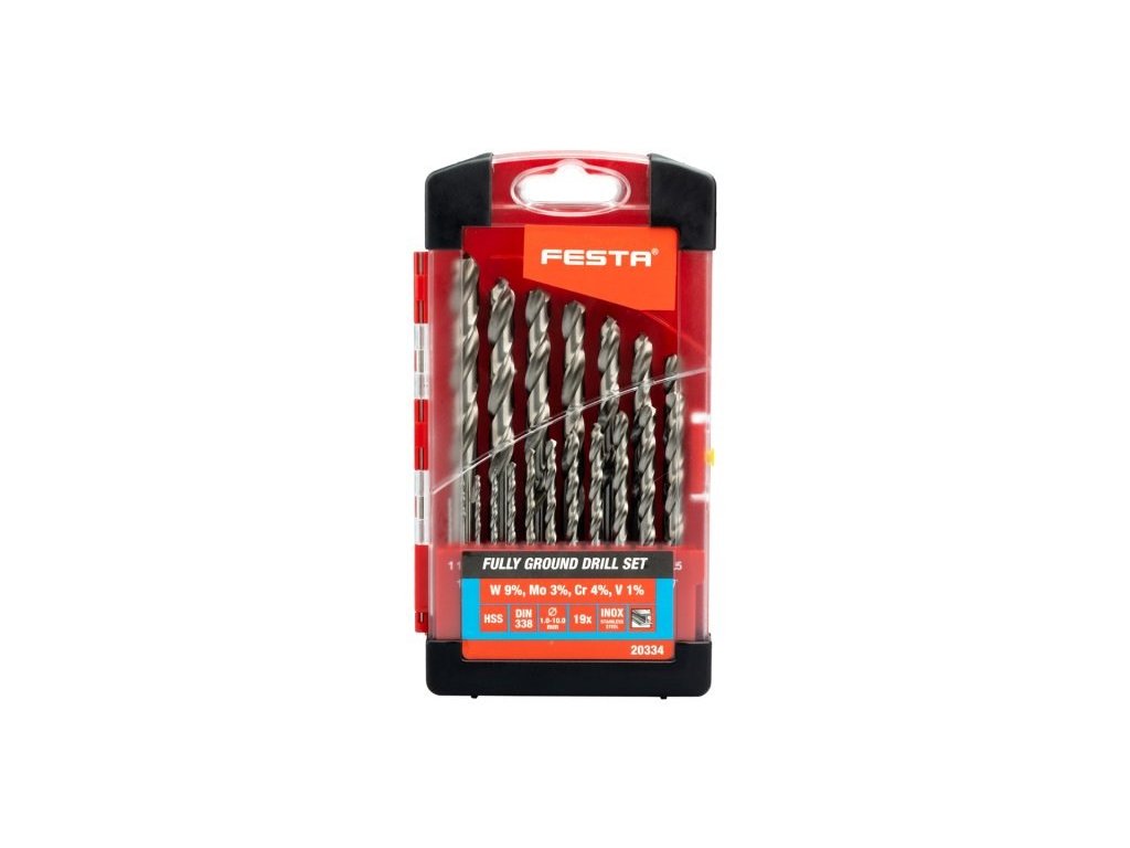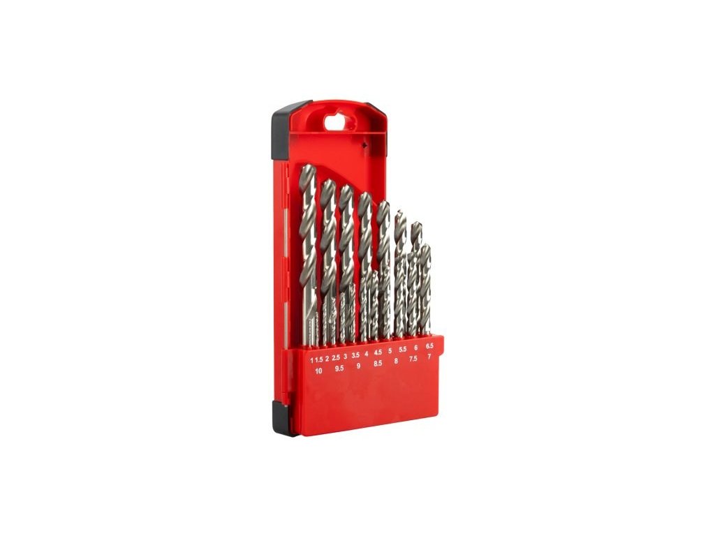 Sada vybrušovaných vrtáků HSS-G, splňující normu DIN 338, RN, vrtáky jsou vyrobené z vysoce kvalitní rychlořezné oceli (HSS), ocel je zušlechtěna legurami - Wolfram 9%, Molybden 3%, Chrom 4%, Vanadium 1% - pro vrtání ocelí do 900 N/mm2. Přesné vybroušení šroubovice pro maximální výkon, přesnost a dobré středění, díky vybroušení úhlu špičky vrtáku 118° lze vrtat i bez nutnosti použití důlčíku, určené pro průmyslové použití.