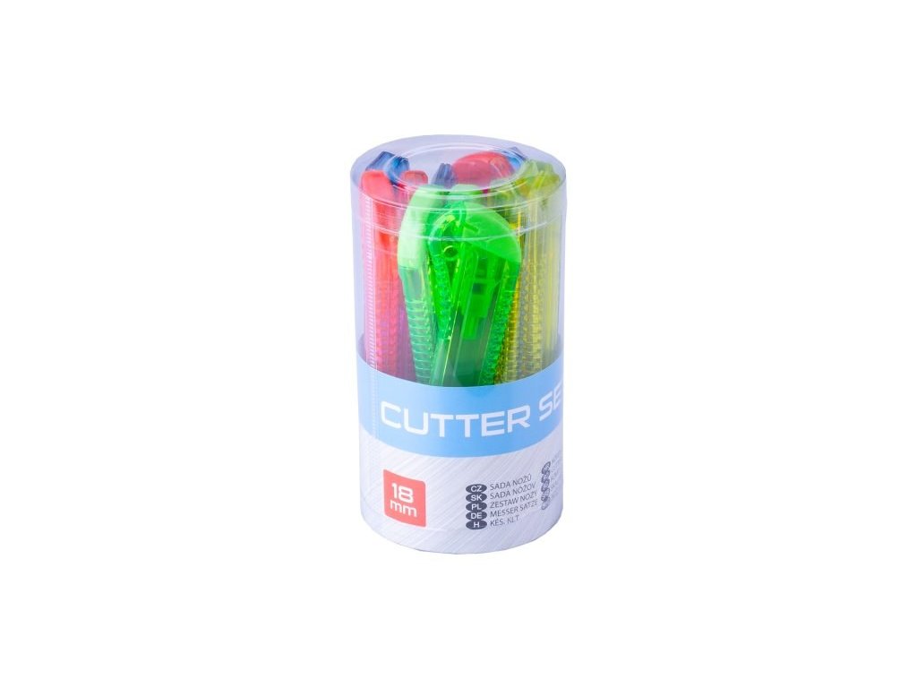 Sada plastových odlamovacích nožů 18mm, 12ksů, plastová kruhová dóza, barevný mix.