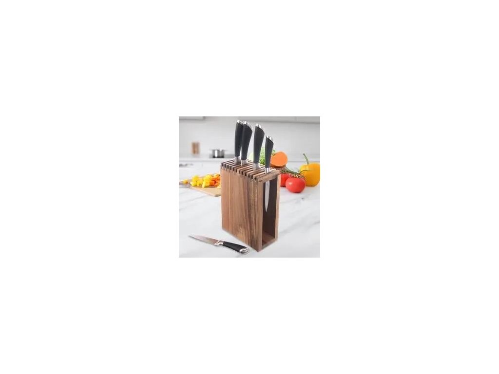Praktickým řešením k uložení ostrých kuchyňských nožů je stojan na nože. V tomto stabilním stojanu z ořechového dřeva lze uložit nože, ať už jde o malé nože na zeleninu nebo velké santoku nože se širším ostřím. Každý nůž stačí vsunout do drážky v horní části, takže se nebudou o sebe třít, nedojde k tupení a poškození ostří. Příjemné masivní dřevěné provedení se hodí do tradiční i moderní kuchyně. Ze spodní strany jsou plastové podložky, zamezující poškrábání kuchyňské linky.Doplňkové parametry