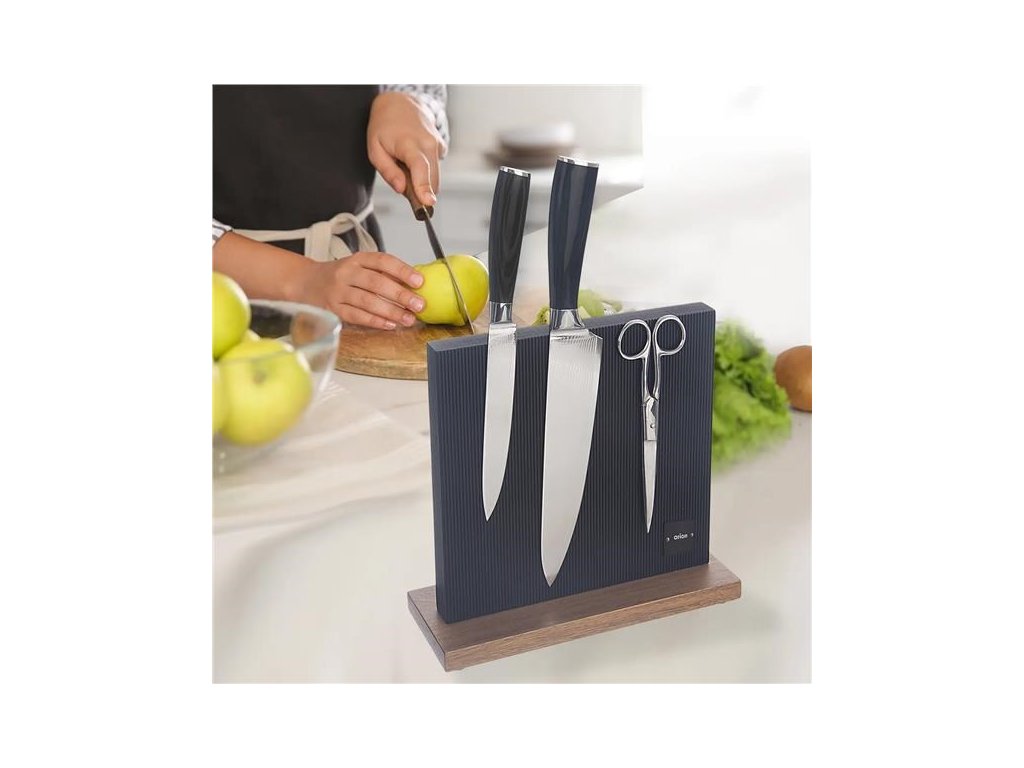 Magnetický oboustranný blok na nože, nůžky a jiné kovové kuchyňské náčiní je výborným místem, jak vše uložit. Ostří nožů se nepoškodí tak, jak by tomu bylo v zásuvce, kde může vzájemným třením docházet k tupení. Navíc se složitě nemusíte trefovat do jednotlivých otvorů/slotů, jak tomu je u některých stojanů. Stačí nože přiložit k ploše. Příjemný povrch soft touch coating (z termoplastické gumy TPR) je odolný a neodírá se. Design je jednoduchý, kombinuje podstavec z akáciového dřeva a pevnou černou magnetickou plochu (neodymový magnet, plast). Navíc má ze spodní stany podložky, takže nepoškrábe pracovní plochu. Vlastnosti produktu Kolekce: BLACK Materiál: dřevo, termoplastická guma TPR Barvy: černá Délka (cm): 24 Šířka (cm): 9,5 Výška (cm): 23,5 Hmotnost (g): 1 339 Tvar: hranatý Vlastnosti: plastové podložky Vhodné do myčky: neDoplňkové parametry