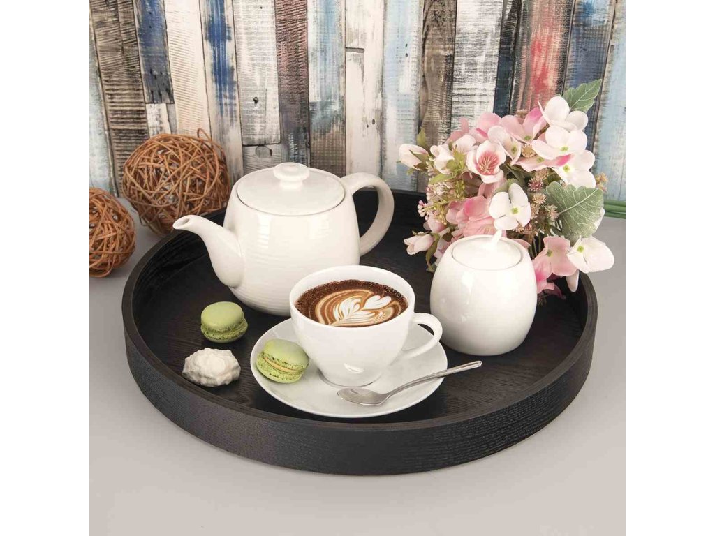 Větší černý tác se spodní plochou ze dřeva, s boky z dřevovláknité desky MDF, je ideální k servírování občerstvení. Krásně na něm vypadá i váza s květinami, dochucovací souprava s ubrousky nebo stylová lucerna, přírodniny a kamínky z cest. V případě potřeby jej stačí lehce otřít. Vlastnosti produktu Materiál: dřevovláknitá deska, dřevo Barvy: černá Výška (cm): 4 Průměr (cm): 38 Hmotnost (g): 372 Tvar: kulatý Použití: na servírování, dekoraci Vhodné do myčky: ne Potisk: ne Pro děti: neDoplňkové parametry