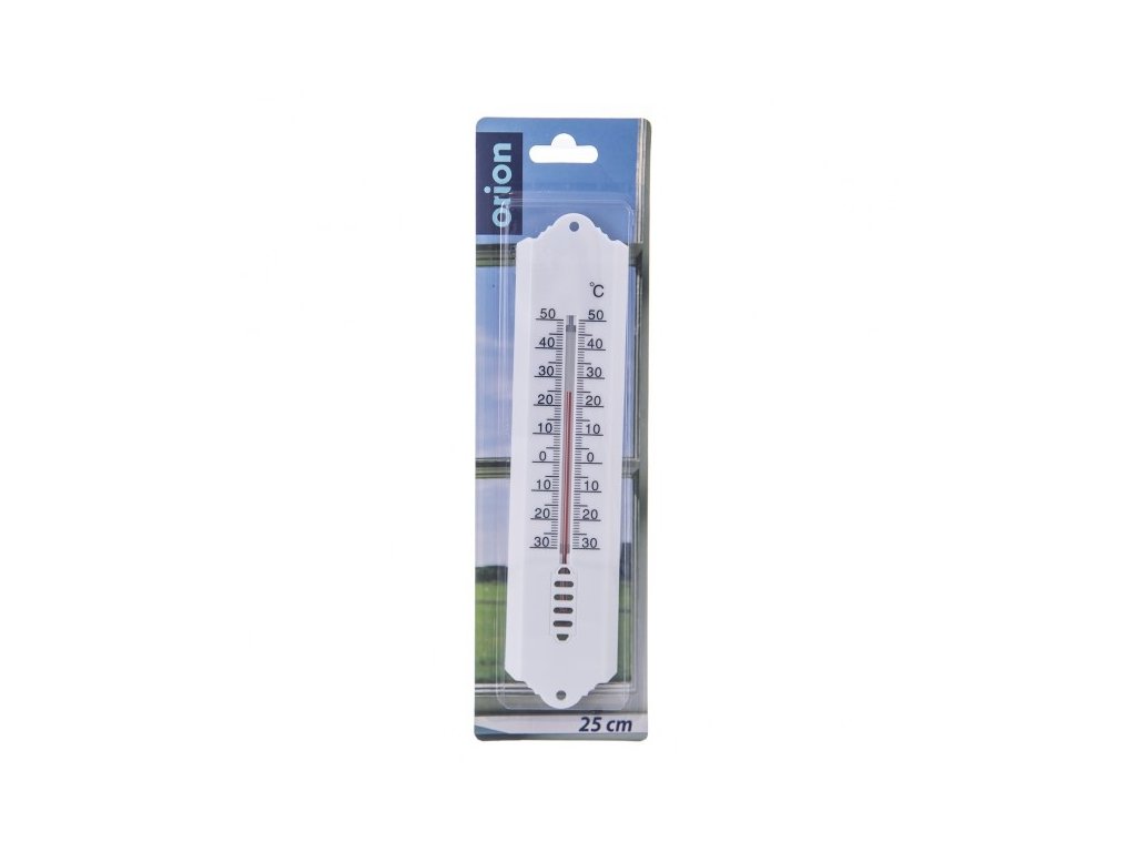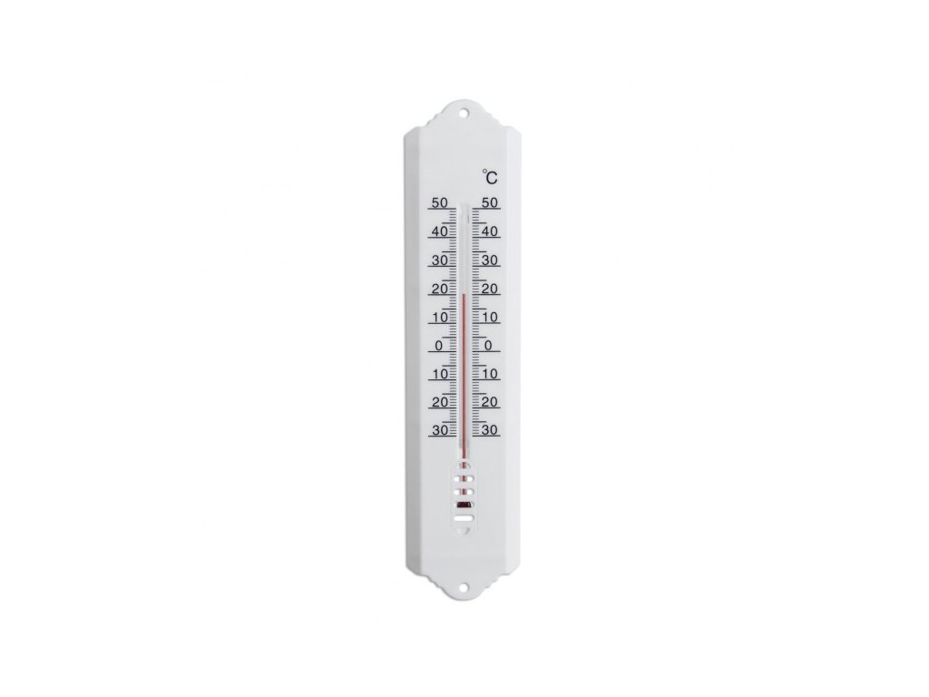 Tento nástěnný plastový teploměr se hodí k měření teploty jak ve vnitřních, tak i venkovních prostorech. Rozsah stupnice je od - 30 °C do 50 °C. Teploměr umístěte tak, aby nebyl vystaven přímému slunečnímu záření, došlo by ke zkreslení hodnot. Vlastnosti produktu Materiál: plast Šířka (cm): 5,5 Výška (cm): 25 Hmotnost (g): 32 Použití: univerzálníDoplňkové parametry