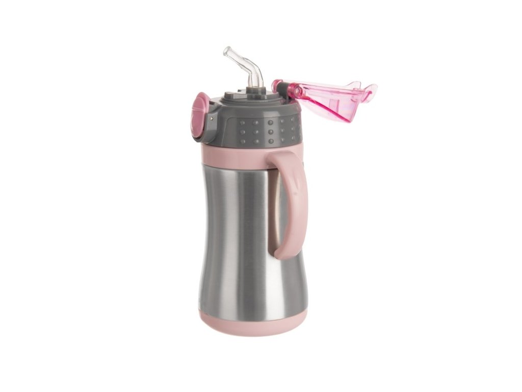 Termoska udrží nápoj v chladu teplý a v horkých dnech chladný po delší dobu, protože jinak se obsah může snadno v teple zkazit. To se může hodit na výletě, cestě na nákupy s kočárkem i na hřišti. Termoska s víčkem opatřeným pítkem a dvěma uchy poslouží na nápoje pro menší děti, ale také pro seniory, kteří už hůře pijí z klasických hrnečků a lahví. Víčko se uvolní stisknutím dolní části plastového otevírání, pak ho stačí zaklapnout zpět a nádoba je uzavřena. Pokud tlačítko posunete nahoru, dojde k uzamknutí, což zabrání nechtěnému otevření. Víčko lze zajistit proti zpětnému zavírání víčka pomocí západky v zadní části víčka. Přednosti termosek: nerezové dvoustěnné, vakuové provedení pro efektivní udržení teploty nápoje, bez BPA dvě růžové rukojeti usnadní lepší uchopení dětskými ručičkami výklopné plastové pítko ve víčku termosky chrání silikonové ohebné brčko, ze kterého se dobře pije víčko se šroubovacím závitem se silikonovým těsněním zamezí nechtěnému rozlití nápoje uvnitř vložené dlouhé brčko umožní pít nápoj bez toho, aniž by uživatel musel termosku naklánět snadná údržba - lze ji umývat běžným způsobem, v teplé vodě se saponátem Tipy, jak ji efektivně používat: Před plněním nalijte do termoplechovky horkou vodu pro teplé nápoje a studenou vodu pro studené nápoje. Nádoba tak přijme teplo nebo se naopak ochladí. Po cca 5ti minutách tuto vodu vylijte a naplňte termoplechovku nápojem. Čím více je naplněná, tím lépe plní svou funkci, ideálně do 90 % objemu. Termoska je vyrobena zvnějšku z nerez. oceli 201, uvnitř 304, plastové části z PP, PC - průhledné víčko, ABS - tlačítko a silikon - brčko a těstění. V nabíce najdete i náhradní brčko. Upozornění: Nádoba není vhodná na perlivé nápoje. Nezavírejte termosku s vařícím nápojem, nepoužívejte ji v případě jakéhokoli poškození. Není hračka. Dětem podávejte nádobu s nápojem vždy až po kontrole, zda není příliš horký. Malé děti by měly používat termosku pod dohledem dospělé osoby. Vlastnosti produktu Materiál: nerezová ocel, plast, silikon Uzávěr/víko: ano Materiál víka/uzávěru: nerezová ocel, plast, silikon Barvy: růžová Výška (cm): 17,5 Průměr (cm): 7,5 Objem (l): 0,33 Hmotnost (g): 320 Ucho: ano Materiál ucha: plast Použití: do školy, na výlet Vhodné do myčky: ne Pro děti: ano Brčko: anoDoplňkové parametry
