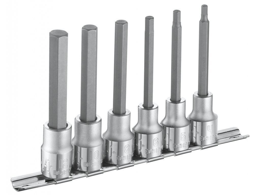 Praktická 6 dílná sada zástrčných šestihraných prodloužených hlavic Tona Expert E032941 na praktické kovové liště je to pravé příslušenství pro vaši dílnu. Hlavice jsou výhradně pro ruční použití a jejich délka je 100 mm. Materiál hlavic je chrom-vanadová ocel s napevno zalisovaným bitem.Specifikace: