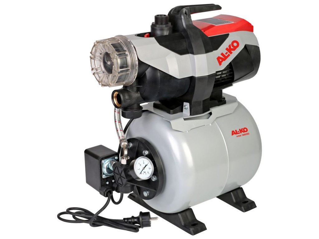 Díky maximální dopravní výšce 38 m a sací výšce 8 m lze domácí vodárnu používat různým činnostem. Pokud chcete čerpat vodu nadzemní nádrže, sudu na dešťovou vodu, nebo hluboké studny, naše domácí vodárna s průtokem až 3600 l/h vás přesvědčí výkonem v každé situaci. Aby se zabránilo poškození hrubým znečištěním, jsou tato vodárna vybavená účinným předfiltrem s dlouhou životností, který lze snadno čistit. Tlaková nádoba o objemu 17 litrů zabezpečuje dostatečnou kapacitu pro okamžitou spotřebu. Tlak při sepnutí 1,5 bar, tlak při vypnutí 2,8 bar. Efektivní sací systém domácí vodárny AL-KO HW 3600 Easy s výkonem 850 W zajišťuje rychlý a stabilní provoz. Energeticky úsporné čerpadlo s ochranou proti chodu nasucho je opatřeno pouzdrem z extrémně odolného plastu, které je vyztuženo skelnými vlákny. Připojení hadic odpovídá standardní velikosti 1\", lze tak snadno použít již dostupné vybavení. Poznámka: Domácí vodárny nejsou vhodné pro čerpání pitné vody, ale pouze pro užitkovou vodu a chlorovanou vodu (bazénová voda) po 35°C. Vodárnu není vhodné používat pro čerpání slané vody, vody obsahující agresivní chemikálie, nebo oleje a vodě obsahující písek. Technická specifikace Výkon motoru ve wattech 850 Značka AL-KO Klíč na filtr ne Maximální dopravní výška v m 38 Tlakoměr manometr Průměr tlakového potrubí G 1\" (33,3 mm) Maximální sací výška v m 8 Garantovaná hlučnost [db (A)] 76 Průměr sacího potrubí G 1\" (33,3 mm) Tlakový spínač v barech 1 Ochrana proti chodu nasucho ne Akustický výkon LwA[dB(A)] 74 Maximální tlak v barech 3.8 Tlakový vypínač v barech 2.8 Objem expanzní nádoby v l 17 Tlakový spínač mechanicky Filtr ano Maximální průtok l/h 3600 Produktová řada Easy Pohon čerpadla 1 polohaDoplňkové parametry