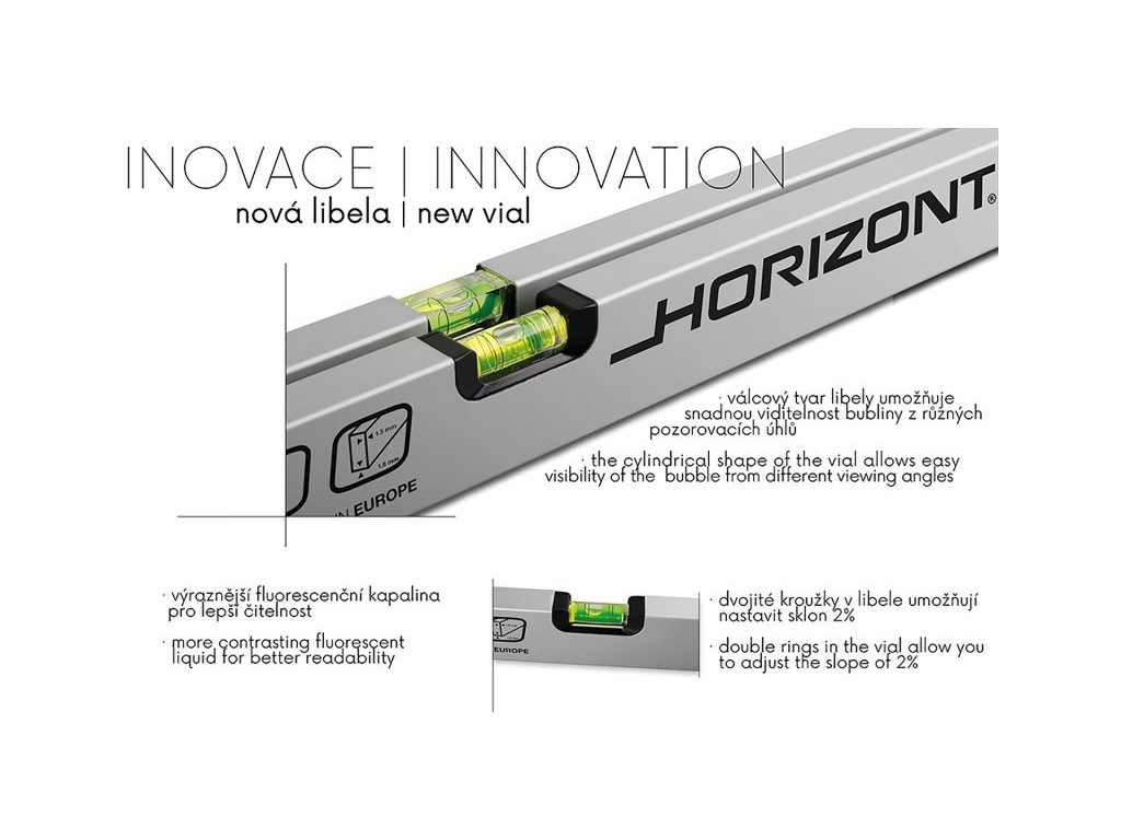 • inovovaná horizontální válcová libela - snadná viditelnost ze všech úhlů pohledu • dvojité kroužky v libele - vnější kroužky pro sklon 2% • výraznější fluorescenční kapalina pro lepší viditelnost bubliny na slunci i v horších světelných podmínkách • vodováha se dvěma libelami přesnost 0,5mm/m = 0,0285° • tloušťka stěny ALU profilu 1,5 mm, eloxovaný otěruvzdorný povrch • magnetické provedení - silné magnety, pro práci v zámečnictví, usazování kovových zárubní, atd. • vodováha je odolná proti provozním nárazům • 10 let záruka na libely, KAŽDÝ KUS ELEKTRONICKY TESTOVÁNDoplňkové parametry