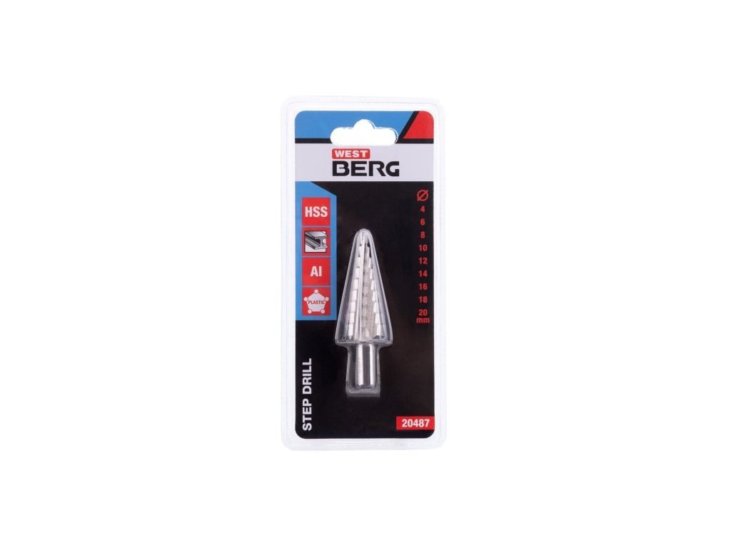 Stupňovitý vrták z kvalitní HSS oceli DIN 1412C, použití: pro vrtání slitin a ocelových plátů do tloušťky 4 mm, plastu a dřeva, široké drážky snadno odvedou odvrtaný materiál, rozměry: 9 stupňů, O 4 - 20 mm, průměrů jsou označeny na vrtáku(nebo obalu).