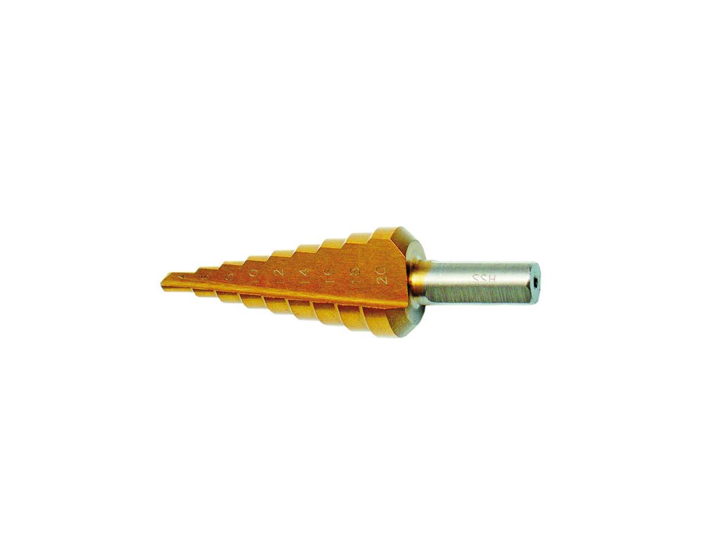 Stupňovitý vrták z kvalitní HSS oceli DIN 1412C, použití: pro vrtání slitin a ocelových plátů do tloušťky 4 mm, plastu a dřeva, široké drážky snadno odvedou odvrtaný materiál, rozměry: 13 stupňů, O 5 - 35 mm, průměrů jsou označeny na vrtáku(nebo obalu).