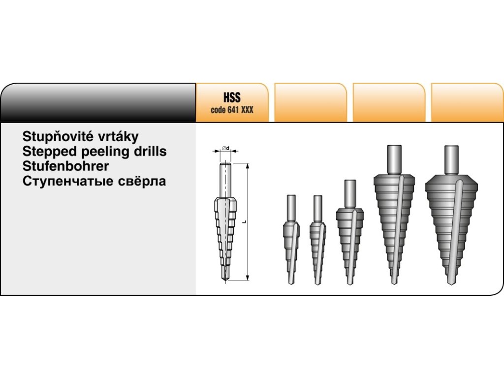 Stupňovitý vrták Podrobnosti: Velikost: 4/20 (č. 1) Průměr D : 4; 6; 8; 10; 12; 14; 16; 18; 20 mm Průměr d : 8 mm L: 75 mmDoplňkové parametry