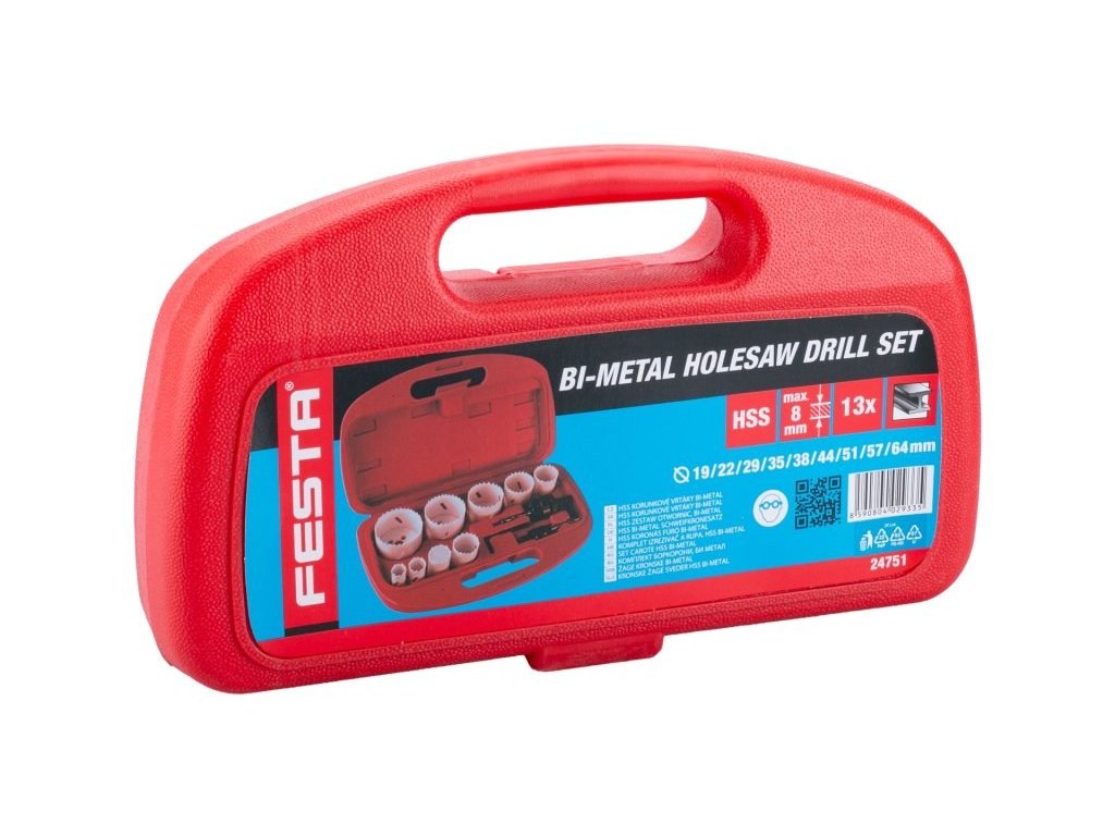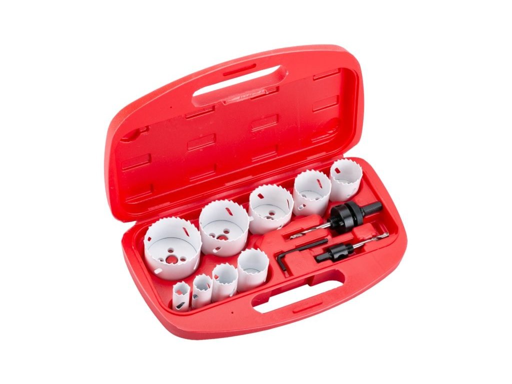 Sada HSS korunkových vrtáků BI-METAL 13ks, Průměry: 19,22,29,38,44,51,57,64 mm, Použití: dřevo, dřevotříska,sádrokarton, kovy do síly 8mm.