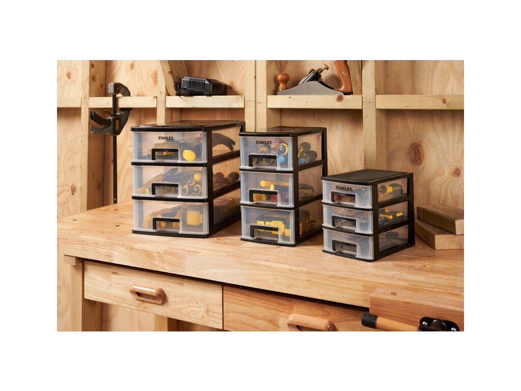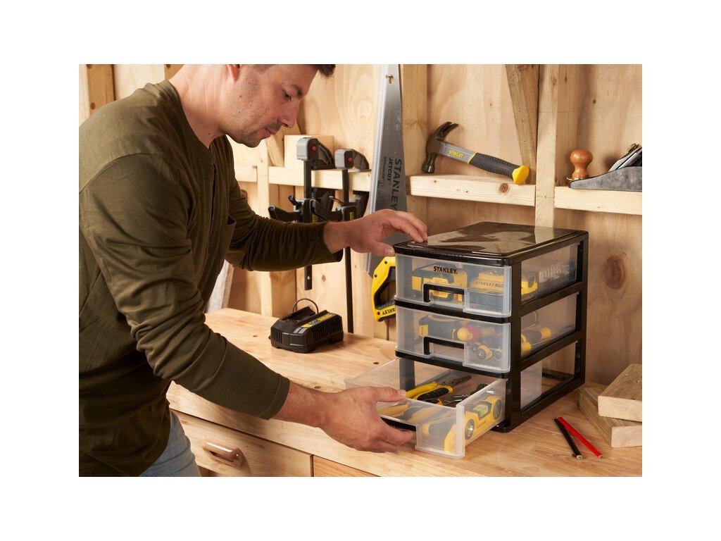 Průhledné zásuvky, poskytují jasnou viditelnost obsahu. Vyjímatelné zásuvky se zarážkami pro snadný přístup k obsahu. Lehká a kompaktní polypropylenová konstrukce, ideální pro použití v dílnách a garážích. Rozměry: Délka:34 cm Výška:32 cm Šířka: 24,5 cm Celková hmotnost: 1,5 kgDoplňkové parametry