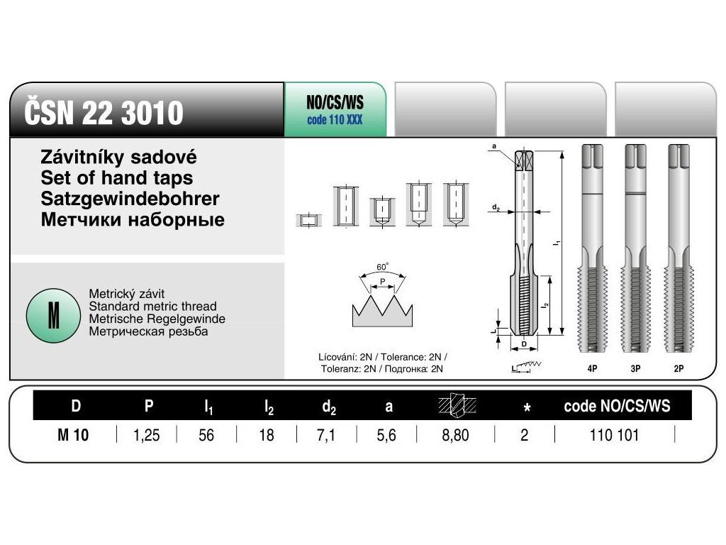 Závitníky sadové M10. Podrobnosti v mm - D: 10, P: 1,25, l1: 56, l2: 18, d2: 7,10, a: 5,60, předvrtání otvoru: 8,80. 2 kusy v sadě.Doplňkové parametry