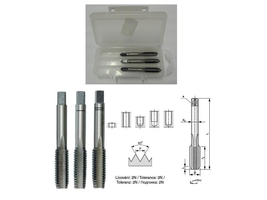 Závitníky sadové M12. Podrobnosti v mm - D: 12, P: 1, l1: 60, l2: 22, d2: 9, a: 7,10, předvrtání otvoru: 11. 2 kusy v sadě.Doplňkové parametry