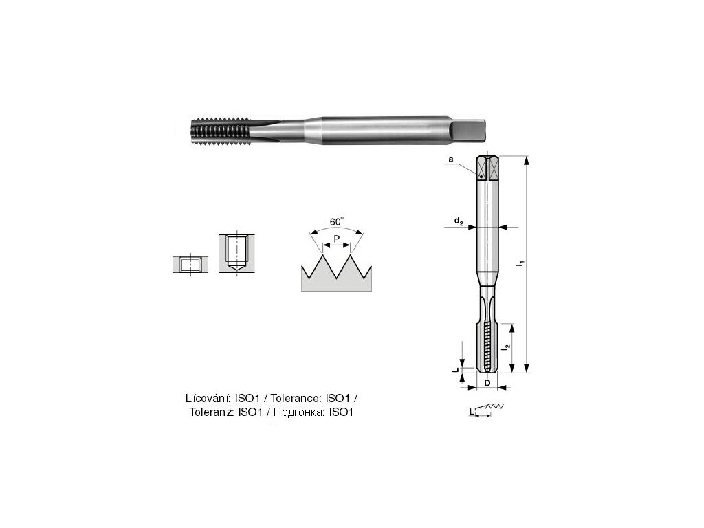 Strojní závitník - broušený přímá drážka s lamačem třísek M3. Podrobnosti v mm - D: 3, P: 0,50, l1: 48, l2: 11, d2: 3,15, a: 2,50, předvrtání otvoru: 2,50.