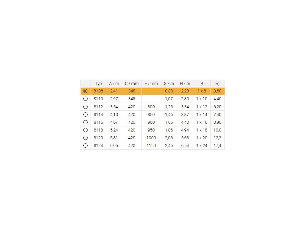 Jednoduchý opěrný žebřík Forte SPECIFIKACE Počet příček: 1 x 8 Délka: 2,41 m Šířka: 340 mm Hmotnost: 3,60 kgDoplňkové parametry