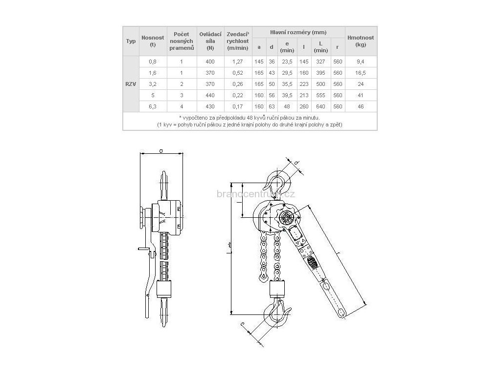 Zvedák řehtačkový s válečkovým řetězem RZV/1,6t 1,5m zdvih